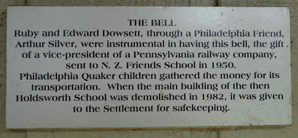 The Bell at the Quaker Settlement, New Zealand, was a gift from Philadelphia Friends who had it transported in 1950.